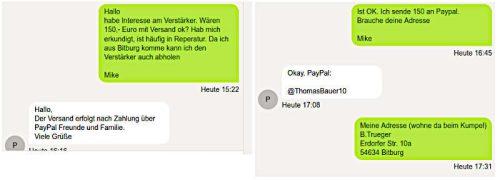 Das ist schon kein Betrugs-Verdacht mehr, das ist – das wage ich tatsächlich zu behaupten – eine Anzeige zum Zwecke des Betrugs. Ich kann das deshalb behaupten, weil ein Bekannter von mir genau diesen Verstärker ein paar Tage zuvor über das gleiche Portal verkauft hat. Hier