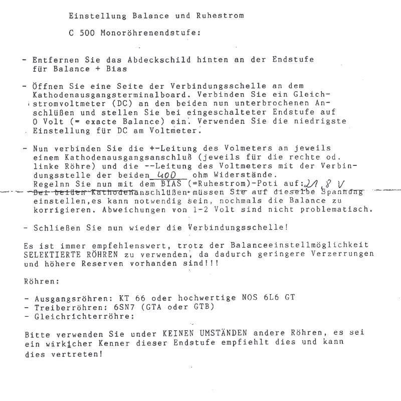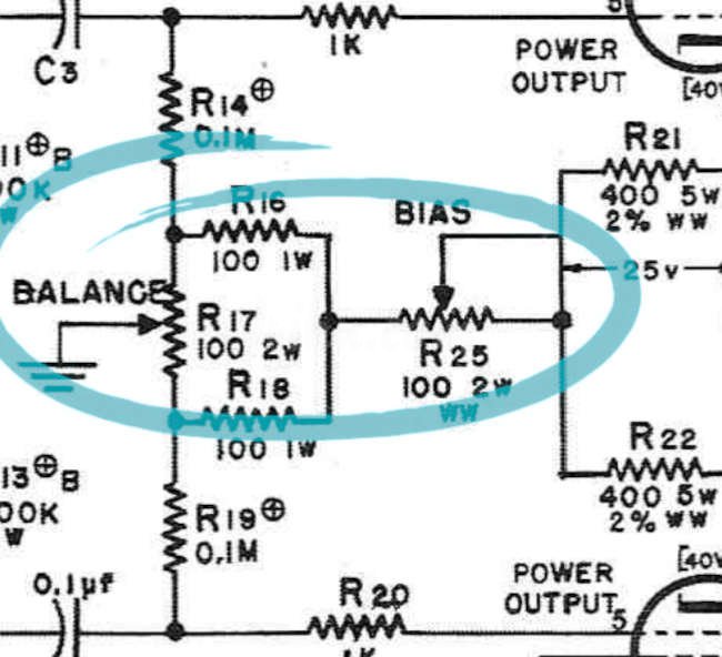 Die zwei netten fetten regelbaren Widerstände (Potis) regeln keine negative Vorspannung, sondern haben „nur“ die Aufgabe, das Endröhrenpaar zum einen in einem perfekten Arbeitspunkt zu nageln, zum anderen um eine perfekte Signal-Symmetrie zu erzwingen.