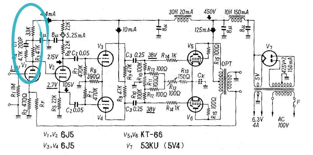 Nun denn. Nachdem die KT66 warm gelaufen sind, ergibt sich am angegebenen Messpunkt – nach ein bisschen BIAS-Justage – ein Spannungsabfall von 22V (anstatt den „vorgeschriebenen“ 21,8V – was schon damals Quatsch war. Als ob 0,2V Differenz in der Röhrentechnik eine Rolle spielen). Das entspricht schlussendlich ein Wert von rund 55mA pro KT66 in Class-A, also Kathoden-BIAS. Bei gut 440V an der Anode läuft sie damit à point.