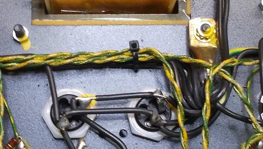 Vor allem die Art, wie und vor allem womit verkabelt wurde: Kupferadern, zT. aus’m Baumarkt Abteilung Hauselektrik. Einen amtlichen Ring-Kabelschuh aus der Kraftwerkstechnik… Lustig dagegen der etwas mager dimensionierte Gleichrichter, der mit über 400µF Siebkapazität fertig werden muss. Kurze Spannungsmessung: Direkt nach dem Einschalten zeigt die Anzeige etwa 430V an…