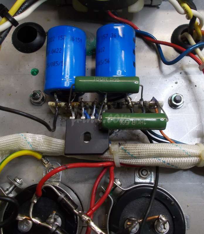 Die Hochspannung wird mit vier einzelnen Dioden (völlig richtig) gleichgerichtet und zu der ersten Elkobatterie geführt. Hier finden sich Elkos mit je 2x 100µF in einem Gehäuse. Je Elko sind diese beiden Kapazitäten parallel geschaltet (ergibt dann also 200µF). Um Spanungsfestigkeit zu erhalten, sind je zwei Elkos seriell geschaltet. Dadurch wird die Kapazität wieder halbiert. Ergibt dann in der Summe 100µF / 1000V je Elkobatterie.